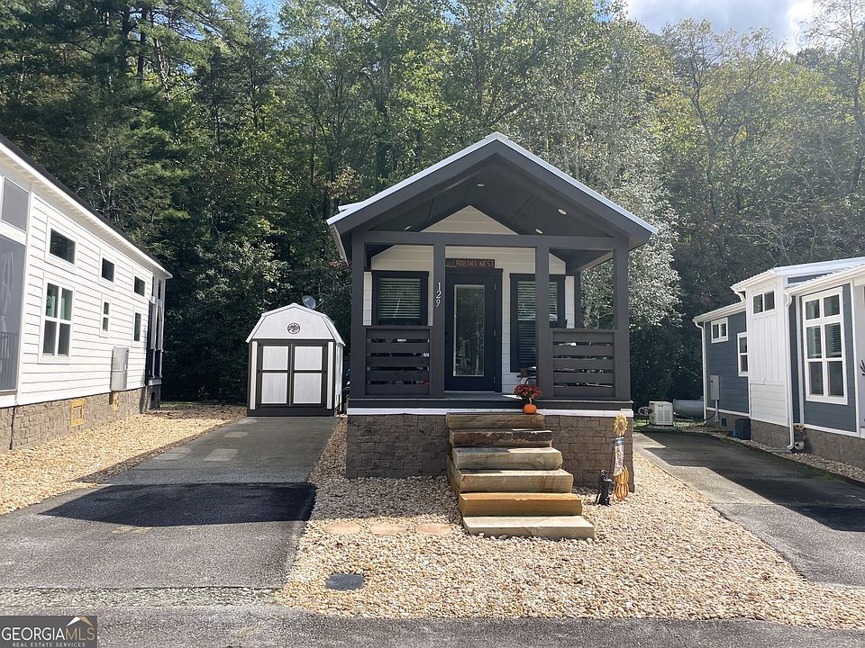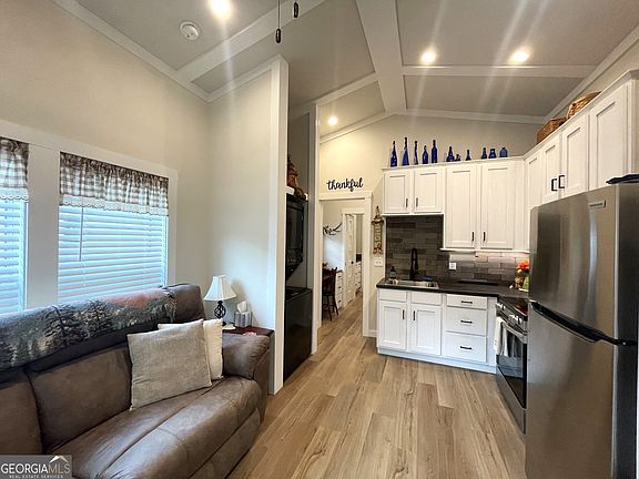 Located in the gated Sugar Mill Creek community, this charming farmhouse-style cabin offers approximately 396 sq. ft. of thoughtfully designed living space. The open interior features a vaulted ceiling, stainless steel appliances, kitchen pantry, abundant cabinetry, and a bedroom with closet space. A spacious bath enhances the home's functionality, while additional conveniences include a stackable washer and dryer, tankless hot water heater, two mini-split systems, and an 8x12 barn-style shed for extra storage. Relax on the open porch or enjoy the community's creekside walking trails, dog park, clubhouse, and fire pits. Conveniently located near Lake Burton, Laprades Marina, and local dining, this tiny home is move-in ready and waiting for you! Charming RV Park Model with title located in Sugar Mill Creek. Buyer will purchase the home; lot lease is $581.79/month, covering water, septic, and grounds maintenance. Enjoy a well-kept community with convenient access to nearby amenities. Property has a Clarkesville address but is situated in Rabun County.