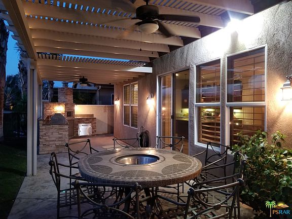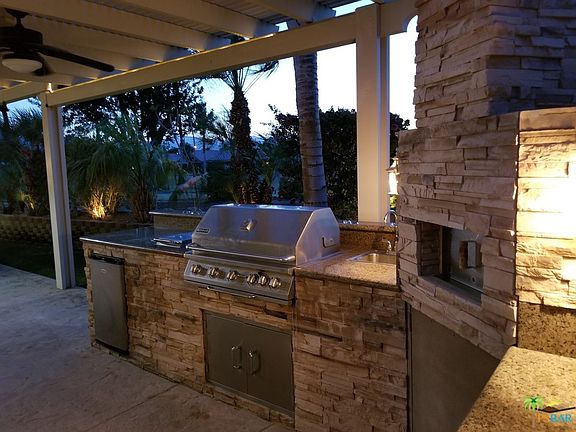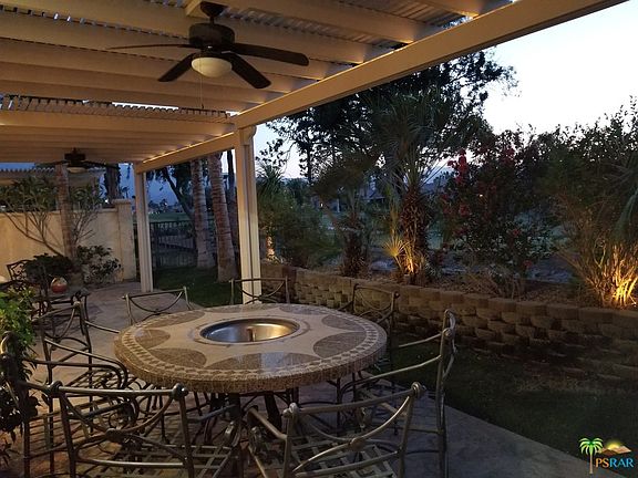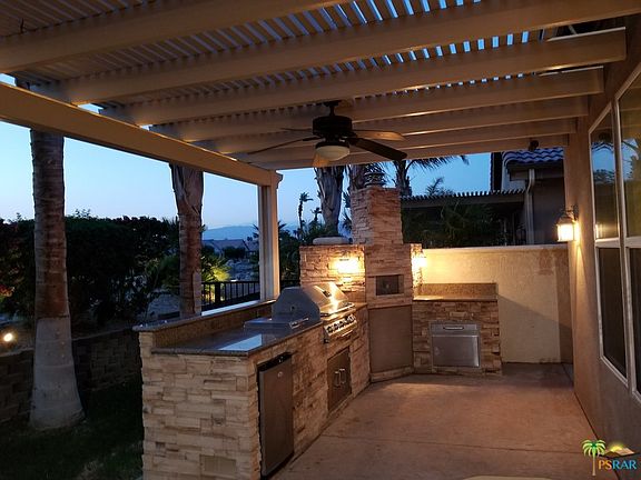 Beautiful and highly upgraded RV home inside Indian Palms CC. Move-in ready, fantastic condition. Some of the upgrades include plantation shutters throughout the house; floor tile; light fixtures and ceiling fans; kitchen cabinets and appliances; built-in entertainment center in living room and master bedroom; built-in bar in living room; granite. Backyard is equipped with built-in custom pizza oven and BBQ. Beautiful outside furniture on back and front patios. Both patios have alumawood covers. Two-car garage; golf cart garage; 50' x 14' RV garage with all hook-ups.So much to see! Please come and lets make a sale!