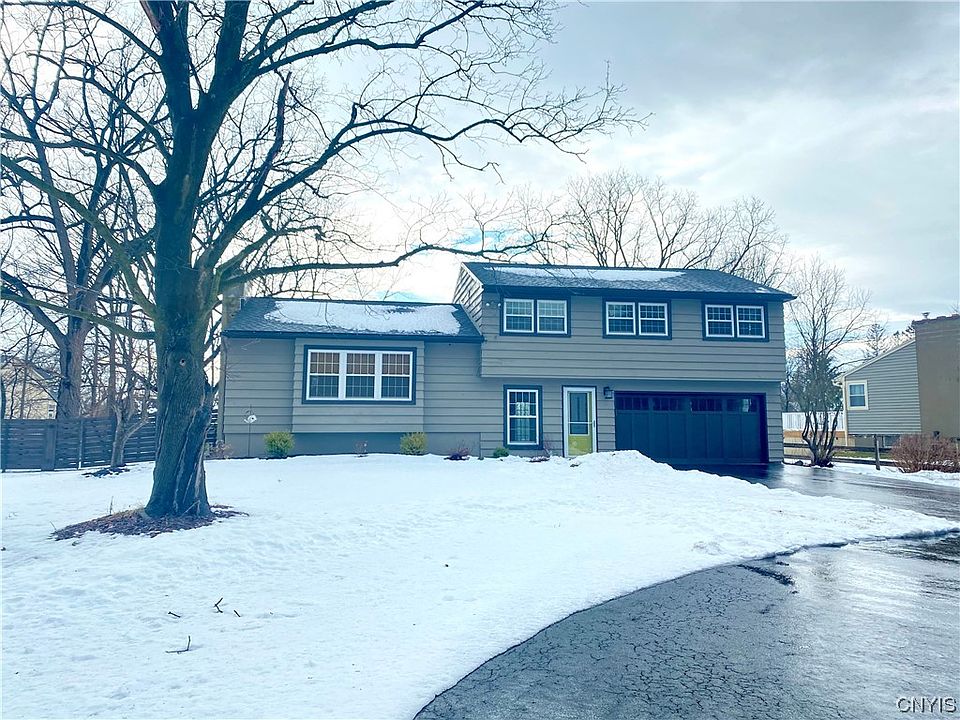 Welcome to 4961 FM road. This Amazing 4 Bedroom 2.5 Bath Split level home reflects a Mid-Century Modern feel and with all the Updates one could ask for! The entry will welcome you and then expect to be impressed by the open floor plan*** Living, Dining & Kitchen area has been completely remodeled with high end finishes including Kraftmaid cabinetry, beautiful Quartz countertops and SS appliances. Relax by the Gas Fireplace on those chilly nights. The slider from the kitchen leads to a spacious deck and Fully fenced yard (installed in 2020) and all situated on a wonderful .53 Acre lot! Gleaming hardwood flooring is throughout most of the home including the 2nd level with the 4 Bedrooms and 2 full baths. The primary bedroom does have a private bath. The finished basement has heated floors in the lovely Family Room. The current owners have it set up with a 5th bedroom (including a workout space). There is an additional storage area as well. So many updates here! In addition to the kitchen renovation ~interior doors, Double Garage door, Furnace, H20 Tank, patio, deck, electrical work, most windows ,new fence and a roof that includes a warranty that conveys! Just MOVE IN and ENJOY!