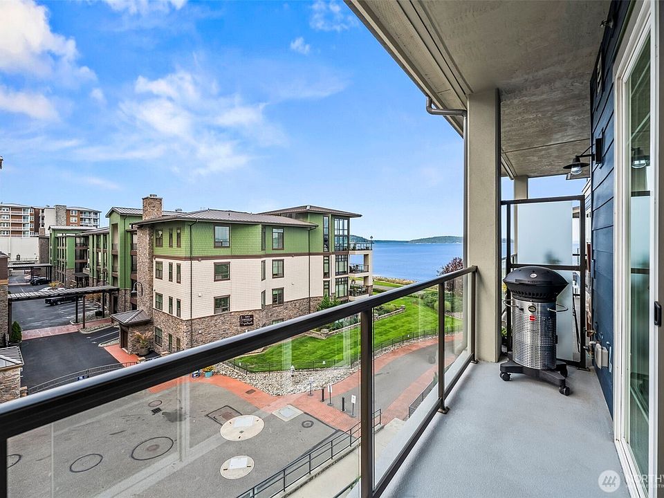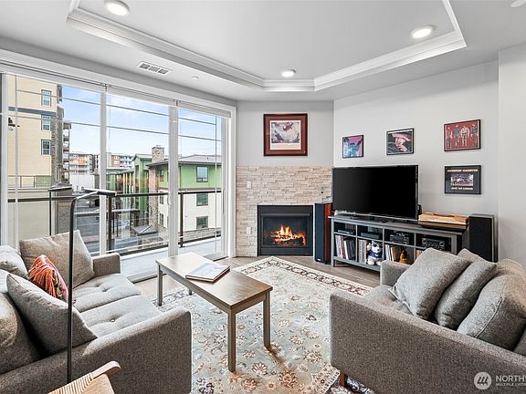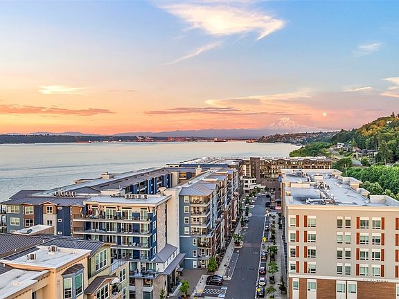Enjoy a partial view from the deck in this beautiful condo featuring hardwood floors, high ceilings + an open floor plan. Relax by the cozy gas fireplace in the LR or head out to the deck to enjoy the partial view. Whip up delicious meals in the Quartz & stainless kitchen open to the comfortable eating area. Spoil yourself in the primary suite with deck access, private bath including dual sinks, custom tile shower with bench & walk-in closet with organizers. 2nd BR + 2nd full BA perfect for guests. Separate laundry with w/d included. 3 storage units + 2 parking spaces (1 EV) are included. NO stairs and NO exterior maintenance - lock & leave! Dinner, movies, shopping & all the fun of Point Ruston are just a short elevator ride away.