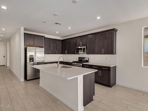 Discover the highly sought after Emerald plan offering 4 bedrooms 3 full bathrooms and a bright, open concept designed for modern living. This beautiful home features welcoming great room that flows seamlessly into the amazing kitchen ,complete with a large center island, generous pantry, ample cabinetry- perfect for entertaining or everyday gatherings. The private primary suite offers a relaxing retreat with a well appointed bathroom and expansive walk in closet. A flexible secondary suite with it's own full bath is ideal for guests, multigenerational living or a home office. Additional bedrooms are thoughtfully positioned for comfort and convenience. Enjoy the best of Arizona indoor/outdoor living with a covered patio and a spacious backyard ready to be customized. Energy efficient construction, modern finishes and designer selected details make this home move-in ready and effortlessly stylish.