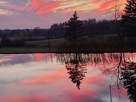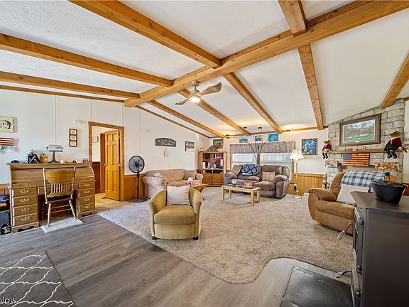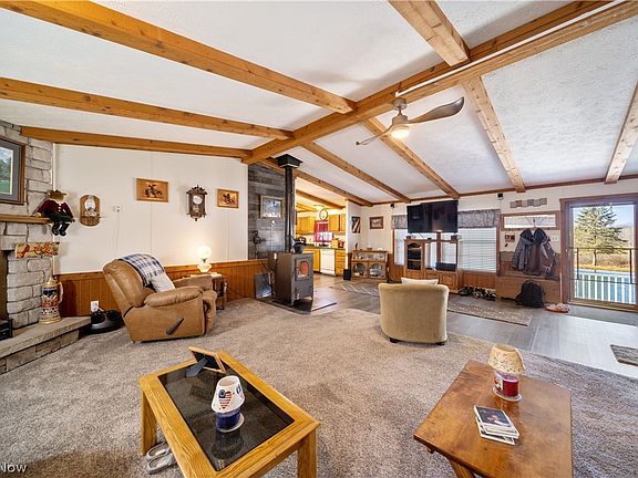 Welcome to this beautiful ranch situated on approx. 3.9 acres including a large pond. This spacious home features an open concept living room/kitchen and the living room boasts beamed cathedral ceilings, fireplace, new wood floors that expand thru the kitchen and hallway area. Owners added a brand new coal burning fireplace with a blower and thermostat. Large master bedroom features a master bath with a new step-in shower and walk in closet. Seller also put new carpet in 2 of the bedrooms. Relax on the front porch overlooking the pond or entertain on the new deck. Other features include a portable generator, barn, shed and 2 car garage with new cement floor and new sidewalk. New hot water tank and central air in 2016. There is a 300# propane tank for the furnace and the furnace is checked and cleaned every year in the spring. Beautiful views of wildlife from every window of the home.