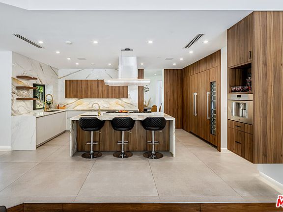 Nestled within the coveted guard-gated enclave of Monte Verde Estates and bordering the prestigious El Caballero Country Club, this Montecito-inspired Spanish estate offers an unparalleled combination of scale, privacy, and timeless elegance. A dramatic rotunda foyer with a skylit stairwell and a sweeping spiral staircase makes a striking first impression, setting the tone for the home's refined interiors. Expansive windows invite an abundance of natural light, while capturing serene hillside views that enhance the sense of openness and connection to nature. The main level is designed for both grand entertaining and effortless living. Two bedrooms flank the great room and formal living room, anchored by a fireplace and wet bar. A temperature-controlled wine cellar adds a sophisticated and convenient touch for the wine connoisseur. The formal dining room overlooks a lush putting green and transitions seamlessly into the gourmet chef's kitchen, appointed with professional-grade stainless steel appliances, a large island, and elegant wood and marble finishes. The kitchen flows into a relaxed, informal family room with a fireplace, and extends outdoors to a heated, covered terrace. Here, multiple lounge and dining areas surround the outdoor kitchen, firepit, pool, spa, TV, and lighted sport courtcreating a private resort-like atmosphere. Upstairs, a private screening room with en-suite bath, which could easily be converted to a seventh bedroom, is complemented by three additional en suite bedrooms. The primary suite crowns the residence with a sitting area and fireplace, private viewing deck, and spa-inspired bath featuring a jetted tub, steam shower, dual vanities, and two custom walk-in closets. Meticulously upgraded and designed for modern luxury, this estate represents one of the finest values within a premier gated community. Just moments from fine dining, shopping, and top-rated schools, it offers the perfect blend of elegance and convenience. Discover the lifestyle of Monte Verde Estates, where sophistication meets serenity.