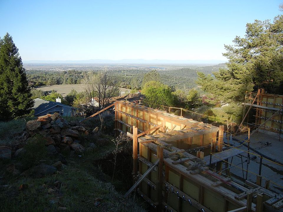 The house sits into the hillside with the building plans having almost 2800 sq. ft. of livable space, 3 bedrooms, 3 full baths, guest/office room, laundry room, great room with vaulted ceiling to third floor, formal dining room and open kitchen floor plan to great room. The garage below totals almost 1600 sq. ft. and will hold 3 vehicles. The hillside has been dug out for the concrete slab, footings and 9’ concrete walls of the garage which have all been poured.