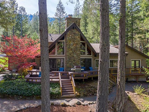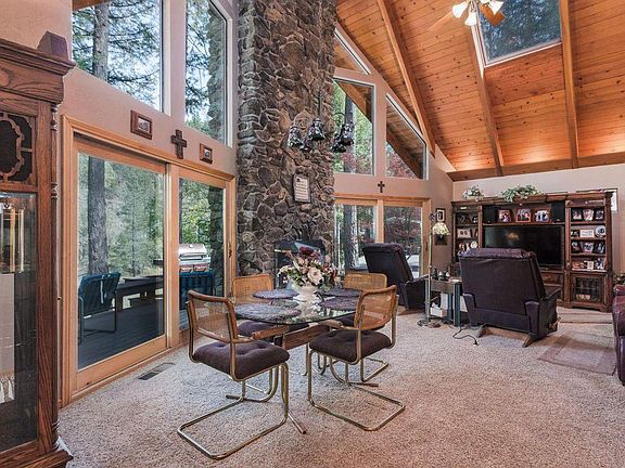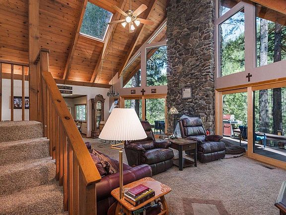 Heavenly Creekside setting amid tall pines! Desirable Evans Creek is seen & heard from this beautiful country chalet! Pride of Ownership abounds! Enter living room w/rock fireplace reaching up to sweeping knotty pine ceiling flanked by tall windows, indirect lighting, skylights & Alder sliders. Staircase leads up to Guest bedroom, bathroom & access to rooftop patio! Kitchen has granite countertops, custom cabinets, wall pantry, pass through & is open to dining area. Hall leeds to 2 guest bedrooms, bathroom & laundry area. Huge family room has picture windows, wood stove, wet bar perfect for entertaining! 2 private offices close by! Master bedroom w/vaulted ceiling, French doors out to deck, walk-in closet, bathroom w/double sinks, newly tiled porcelain floors & easy walk in shower. Enjoy creek views from expansive deck! 1 car garage, RV carport, 2 car carport! Dog run!10.26ac. Too many amenities to list! Schedule to experience this tranquil setting for yourself!