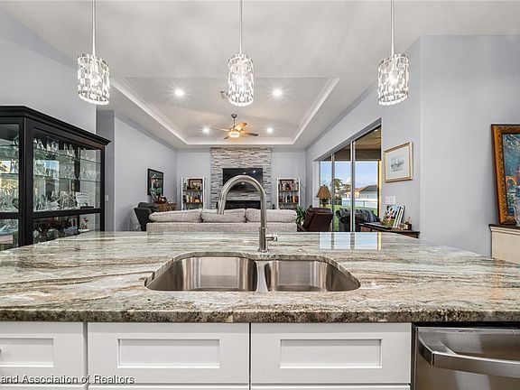 You are welcomed by the high volume covered entry way, which has been finished with wood-look tile; A beautiful touch. Step inside to high-volume ceilings, impact windows and doors, and an inviting layout. The living room features a stone accent wall with a decorative fireplace and coffered ceiling. The master suite also boasts a coffered ceiling with custom lighting. Master spa offers a dual vanity, walk-in shower and a generous walk-in closet. The kitchen is beautifully equipped with a large pantry, white shaker cabinets, granite countertops, stainless steel appliances to include a stove/oven with convection and air fry features. All fans are upgraded with light fixtures, and some cast elegant patterns on the ceilings and walls adding personality, charm and warmth. Pocket sliders open to the rear covered and screened patio making it a seamless indoor/outdoor living space for enjoyment and entertaining. Patio has also been upgraded with wood-like tile flooring, matching the front entry.
