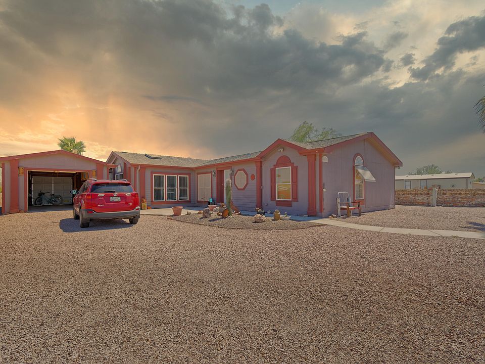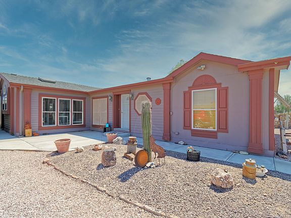 Clean, roomy, well kept modular is truly move in ready. Nicely designed with split bedrooms, large en suite with french doors, custom master shower, large kitchen with island, pantry, dining room, newer appliances, and plenty of natural light. Drive thru 12 X 20 garage leads to backyard with an ATV garage and Screened in Arizona room with misters. There is also an additional gardening shed and a lemon tree on irrigation. RV parking and hookup for small/medium size rig. This is a beauty that needs to be seen before it's gone!