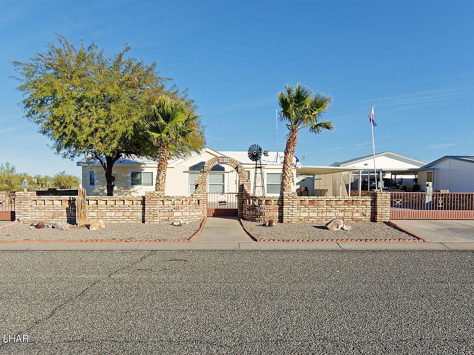 Beloved home in search of new owners in Rainbow Acres. Split floorplan home with master suite, guest bedroom plus an office. Master suite is large with walk in closet, garden tub and shower. Kitchen is in the rear and has 2 dining areas and a large pantry. Fridge, microwave and basic household items convey for your convenience. Plenty of storage throughout the home. In the backyard is a swamp cooled garage with workbenches, 3/4 bath & washer/dryer hookups. There is also as a separate Air conditioned building ready to be your craft room/workshop. Rear covered patio is ready for your BBQ's and get togethers with family & friends. Side carport for parking as well as room for Small/medium size RV to the north side with hookups. Property has desert landscaping on irrigation and is fully walled with Mexican brick with 2 drive gates and 1 man gate. Stove, water heater and furnace on propane for lower power bills. Come check it out today!