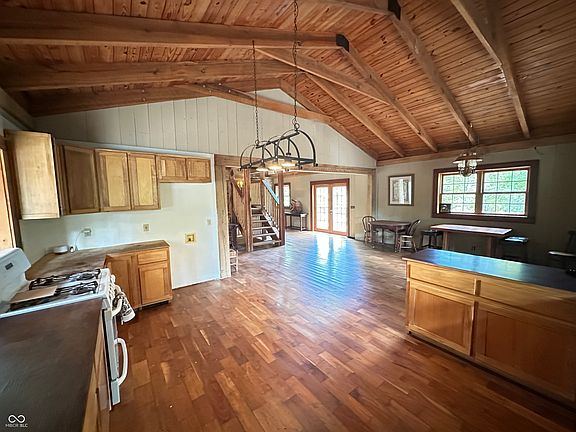 Have you fallen in love with the hills, hollers, and history of Brown County? Follow the winding road through lush forests and up the hilly driveway, and you'll discover a home where the best of Brown County artistry comes together. Sunlight dances through the trees, every corner tells a story, and the serene rhythm of the forest invites you to make this retreat your own. Sitting on 13 acres bordering Yellowwood State Forest, this home was built in 2001 on the original homestead site. This home was designed by local master woodworker and Brown County resident, the late Bob Adair. Every detail bears his hand, enhanced by skilled craftsmen who helped bring his vision to life. Inside, oak beams and cedar and poplar trim add warmth, character, and a nod to the surrounding forest. Technically a 2-bedroom, 3-bath, 2,500-square-foot home, it offers many flex spaces that could serve as sleeping or living areas. Only the appliances were from a big-box store; everything else was thoughtfully crafted locally. Handcrafted oak kitchen cabinets, walnut trim, custom doors from the bottom-of-the-hill shop, and hardwood floors milled from the property's timber complete the picture of local artistry. A centerpiece is the two-story great room with a hand-dry-stacked Brown County stone, three-story fireplace extending into the basement. Upstairs, one bedroom and bath flank a loft with two flex spaces ideal for a sitting area, dressing room, or reading nook, creating a perfect master suite retreat. The main floor has an open kitchen and dining area, with windows, some etched, framing the changing seasons. The living room invites gatherings or quiet reflection by the fire. Through a wood and stained-glass walkway is the 1860s Helms family cabin, offering a summer bedroom, third living room, or creative retreat. Its summer porch provides a new view, and handmade doors include metalwork by blacksmith Jack Brubaker, connecting the property to Brown County artistry. The hillside baseme