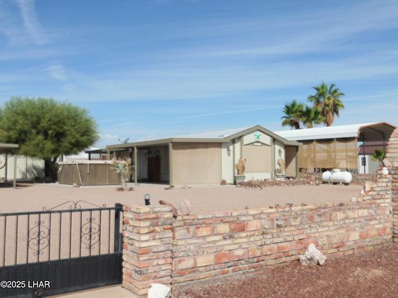Don't miss out on this deal! This property has both a home, a casita for accommodating family and friends, and 2 full RV hookups. The clean and well-maintained manufactured home has 704 sq. ft. of living space. It has 1 bed/1 bath, an open floor plan with kitchen, dining area, and living room combining for your convenience. The kitchen has electric range and oven, breakfast bar, dishwasher, RO system, plenty of counter space and cabinets. Laminate wood flooring is found throughout the home. Ceiling fans are installed in both living room and bedroom. A 25' X 10' porch is attached on the south side of the home while a 4' X 44' porch runs the length of the home on the north side. Step out the backdoor, a versatile spa with the modes of heating, cool pool, and swimming. A 384 sq ft casita is complete with sleeping quarters, full bathroom, air conditioning and laundry room. Laminate flooring is newly installed. A 12' X 20' garage is equipped with remote roll up door, its own electric subpanel, worktables, gun safe, and air conditioning. A 12' x 24' carport is attached to the garage, with a second carport, 11' X 25,' attached to it. Interiors and exteriors of building are recently painted. The roofing of all buildings has been recently treated and sealed. A 12' X 18' storage shed is available for gardening and yard tool storage. For emergencies during electrical failure, there is a Generac Generator ready to meet the property's need. The yard is fully fenced in with Mexican brick walls and wrought iron gates. Two drive-through gates and a walk-through fence allow easy entrance to the property. Both the front and back yard are landscaped appropriately for desert living.