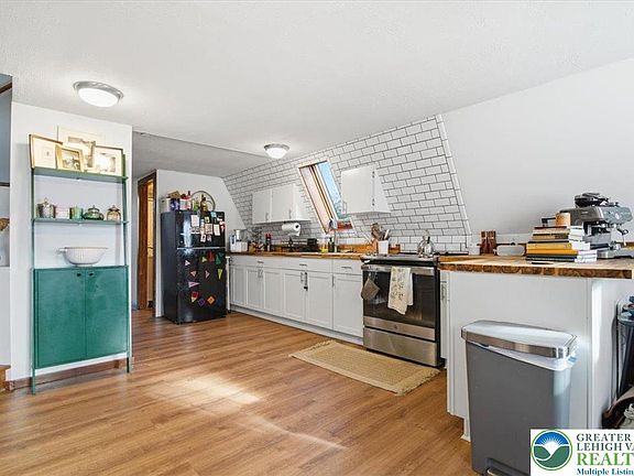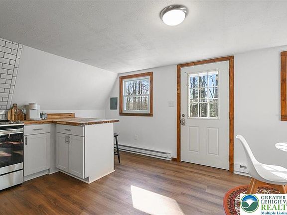 This cute well maintained unique A frame home offers 2 bedrooms, 1 bath nestled on a private 1.73 acre lot in the Pocono Mountains! Enjoy cooking in the modern kitchen with butcher block countertops, subway white tile backsplash and the large brick faced fireplace with a pellet insert to keep the home nice and warm. Enjoy relaxing in the family room with a view of all the natural beauty of each season. A nice sized bedroom, a modern full bath and laundry area complete the first level. The second level offers a master bedroom with vaulted ceilings, sitting area and closets. The oversized detached garage offers plenty of storage. Located near shopping, skiing, State Games land for all your adventures. Call today to schedule your private showing of this super cute home!