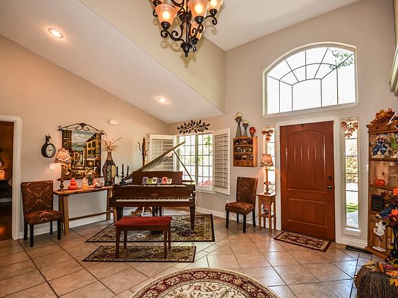 This beautifully crafted home offers secluded privacy on a large 1-acre lot in Rigby. A grand entry, with a desirable sitting room for greeting guests, opens to a brightly lit living room filled with warm, natural light filtering through a wall of windows. Nearby, an oversized, eat-in kitchen supplies enviable space for the household chef create culinary magic; an abundance of cherry cabinets, granite countertops & custom tile backsplash fill the inviting space. A roomy master suite gives way to an attached walk-in closet & ensuite bath boasting a corner jetted tub, separate shower & sprawling dual sink vanity; buyers will love the abundance of grooming space found in this personal retreat. A bonus family room, perfectly constructed as an in-home theater, highlights stadium riser seating, rope accent lighting & comes furnished with a projector, screen & full set of visual/audio equipment required to enjoy the thrill of the big screen from the comfort of home. Outside, the breathtaking wooded lot, frequented by wildlife, showcases gorgeous landscaping with concrete curbing, raised garden beds & a tranquil water feature. This wonderfully maintained home provides an abundance of living & recreation space to accommodate a comfortable, more relaxed lifestyle - away from the city.