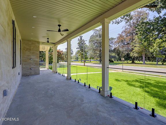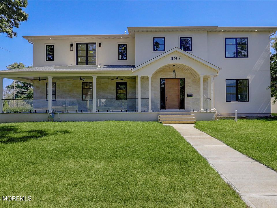 The finished lower level offers versatile living with two legal bedrooms, a full bath, playroom, flexible rooms for a gym or office, and a custom Pesach kitchen. Outdoors, expansive 40-ft front and back porches with sleek glass railings create a striking architectural statement.