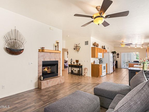 This charming, well-kept Dakota Model features an open floorplan with a tiled covered courtyard that welcomes you into the home. The great room boasts a cozy fireplace, perfect for relaxing or entertaining. The master retreat has everything you could want, including 2 walk-in closets, a walk-in shower, and a private entry to the rear patio. The back patio, enclosed by a block wall, offers privacy and a perfect space for outdoor enjoyment. The garage has cabinets for storage. Enjoy the resort lifestyle included in your fee, which covers property taxes, trash, and full access to clubhouse amenities: pickleball, dog parks, walking paths, fitness center, heated pool & spa, Bingo, Karaoke, live bands, potlucks, and numerous clubs. Don't miss your chance to make this wonderful home yours!