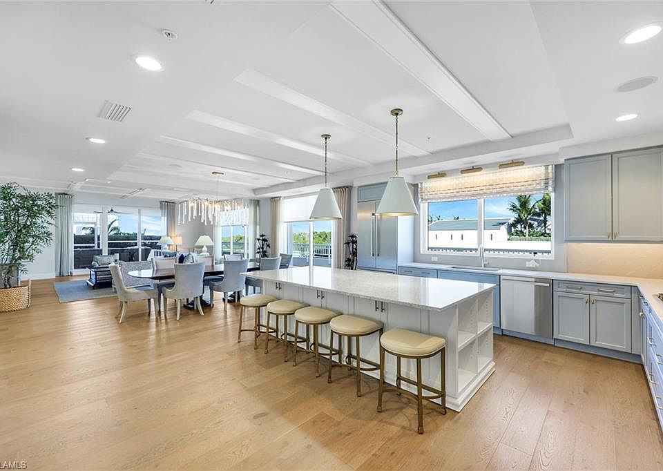 Step into a world of refined coastal luxury in this rare and glamorous terrace residence, 3 bedroom plus den, 4 bath FURNISHED END UNIT at Seaglass at Bonita Bay—one of Southwest Florida’s newest and most architecturally striking luxury towers. This like-new, impeccably designed end unit combines the sophistication of a high-rise with the comfort and accessibility of a single-family home, all while showcasing the ultimate in high-end finishes and modern conveniences. From the moment you enter through your private, secure elevator lobby, the level of quality is unmistakable. Nearly 3,500 square feet of exquisitely finished interior space is enhanced by soaring ceilings, dramatic floor-to-ceiling impact glass, and a thoughtfully executed open layout that allows every room to feel bright, spacious, and connected to the natural beauty outside. Rich hardwood flooring, designer lighting, custom wallcoverings, and an elegant assortment of luxury fixtures elevate the home’s ambiance with timeless sophistication. The gourmet kitchen features high-end appliances, sleek cabinetry, and expansive prep space—perfect for everyday living or effortless entertaining. What truly sets this residence apart is its extraordinary outdoor living. The oversized screened lanai—with built-in gas grill and hurricane shutters—flows seamlessly onto an expansive 525-square-foot private terrace that lives like an outdoor room. This rare, resort-style setting offers sun-drenched relaxation in the winter months and an unmatched indoor-outdoor lifestyle. From here, there is a short walk that leads directly to the community’s resort pool and spa—an amenity almost unheard of in a luxury tower residence. Inside, the floor plan provides exceptional privacy: the opulent primary suite occupies the west wing of the home, creating a serene, sunset-facing retreat, while the spacious guest suites are set on the opposite side. Every detail has been curated for comfort, style, and a truly elevated living experience. Seaglass itself is a newer, amenity-rich luxury building, offering some of the most impressive lifestyle features in all of Bonita Bay. Residents enjoy an expansive club room, elegant card and billiards rooms, a state-of-the-art fitness center, private movie theater, massage suites, steam rooms, and one of the community’s finest resort-style pools. A breathtaking 28th-floor rooftop terrace delivers panoramic views from Naples to Fort Myers—making it the perfect place to celebrate sunset or unwind under the stars. Beyond the tower, Bonita Bay provides an unrivaled array of amenities, including a private beach park, marina with dining, miles of scenic trails, pickleball and tennis facilities, and optional membership to a world-class club featuring five championship golf courses and multiple restaurants. Whether you’re seeking a full-time sanctuary or an indulgent seasonal escape, this exceptional home sets a new standard for high-end living in Southwest Florida.