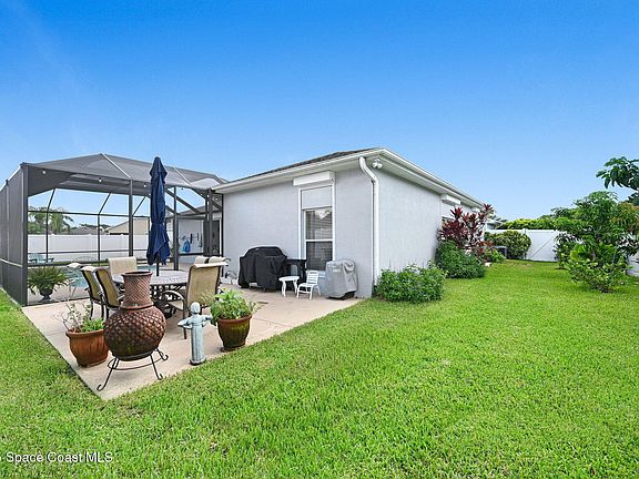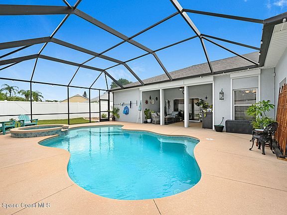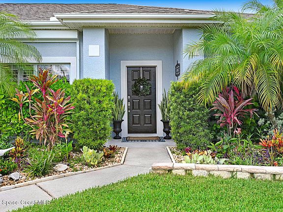 Pride of Ownership Shows! Come and see this Concrete Block POOL Home in Highly Sought-After Pineda Crossing! This beautifully maintained home features lush tropical landscaping and an abundance of fruit trees—truly a gardener's paradise! Inside, enjoy volume ceilings, decorative alcoves, and a spacious open floorplan. Recently painted - Interior & Exterior! The kitchen features stainless steel appliances, ample cabinetry, soft-close drawers, and new quartz countertops, sink basin, and faucet. Electric roll-down STORM SHUTTERS provide full-home protection. The primary suite includes a HARD TO FIND walk-in closet, and a recently updated bath with dual vanities, quartz counters, and a walk-in shower. Relax or entertain in your private, FENCED backyard with sparkling pool. LOW HOA. Close to shopping, restaurants & more. Just minutes to Patrick Space Force Base & the BEACH!! Call today!
