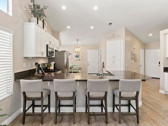 Tucked away in the inviting community of Lake Rancho Viejo, this turn-key Fallbrook home sits among rolling hills with peaceful, beautiful views. Start your day with a warm drink on the front porch and catch the sunrise spilling over the mountains or walking around the lakeside trails, great for animal lovers and bird watching - seriously serene. Inside, the open-concept layout feels airy and bright, with high ceilings and sunlight pouring in from every angle. Thoughtfully renovated in 2017, the home features stylish, waterproof grey vinyl plank flooring, modern lighting, updated kitchen cabinets, quartz countertops, and sleek stainless steel appliances—including a gas range for those who love to cook. The bathrooms were elegantly renovated with updated vanities and faucets. The laundry room is equipped with a newer washer and dryer. A new HVAC was added in 2017 and a brand new hot water heater in 2023. A spacious two-car garage and generous front yard give you room to spread out and enjoy. Inside, the wood-burning fireplace in the living room is perfect for cozy evenings under the tall, vaulted ceilings. Beyond the home, the neighborhood offers something for everyone—scenic walking paths, playgrounds, tennis and sand volleyball courts, plus a community pool and clubhouse. With quick access to I-15 and Highway 76, and located in the well-regarded Bonsall School District, this one checks all the boxes.