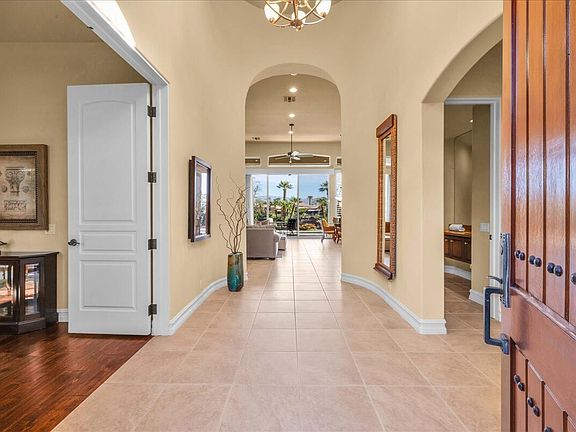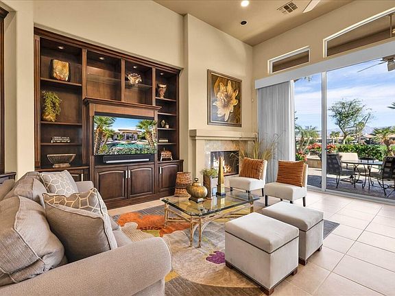Experience unparalleled luxury in this premier golf, tennis, and lifestyle community! This first-time-on-the-market, highly upgraded Encanto 1 floor plan offers 2,635 sq. ft. of impeccable living space, featuring 3 bedrooms, 3.5 bathrooms, and a versatile bonus room/office. Step through a beautifully landscaped courtyard and custom front door into a grand foyer with soaring ceilings. The neutral tile flooring in living areas and baths, along with engineered wood flooring in bedrooms and the bonus room, provides a perfect backdrop for your personal style. Each bedroom boasts an en-suite bath and ample closet space. The great room, with custom built-in cabinetry, opens to the rear yard through 10' Fleetwood sliding doors, offering breathtaking lake and fairway views of the 13th hole of the ''Jones'' course. Enjoy outdoor living with a stunning pool, waterfall, and built-in BBQ island. 3-car garage with Clopay doors, newer HVAC, and water heater plus many other upgrades. HOA dues include 24-hour security, front yard maintenance, high-speed internet, DirectTV stream service, and a sports/social membership to Rancho La Quinta Country Club.