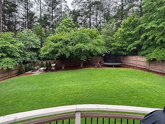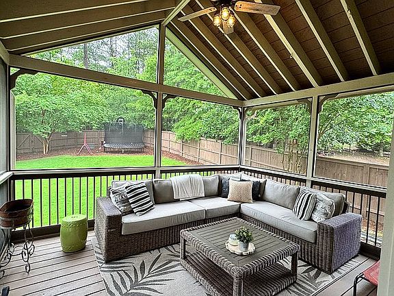 Welcome home to a beautiful, northeast-facing home in the sought-after Brandon Hall neighborhood. The gorgeous home features five bedrooms, plus a dedicated office. The two-story living area boasts a stunning stone fireplace with built-in cabinetry. A screened-in porch, flat, fenced-in backyard, and wooded privacy are the highlights of this home. The open floor plan connects the heart of the home, the kitchen, dining, and living area. In addition, the main level includes a bedroom, a full bathroom, and a separate dining room. Upstairs, the expansive primary suite offers a luxurious bath and large closet space. Two additional bedrooms share a Jack-and-Jill bathroom, and a fourth upstairs bedroom features its own full bath. All upstairs spaces, as well as the downstairs bedroom and office, feature new carpet. The unfinished daylight basement is ready for your custom touches. This move-in-ready home has many upgrades throughout. Brandon Hall is renowned for its exceptional school district with top-rated schools. The neighborhood amenities include a Swim and Tennis Club with LED-let tennis and pickleball courts and shaded pavilions for spectators, a basketball sports court, a children's playground, and a Little Library. The Pool House offers fully equipped bathrooms with showers, a covered patio with fans, BBQ facilities, and two private cabanas. The pool area also includes a water mushroom, a zero-depth toddler area, and a waterslide.