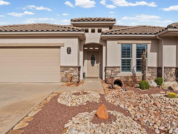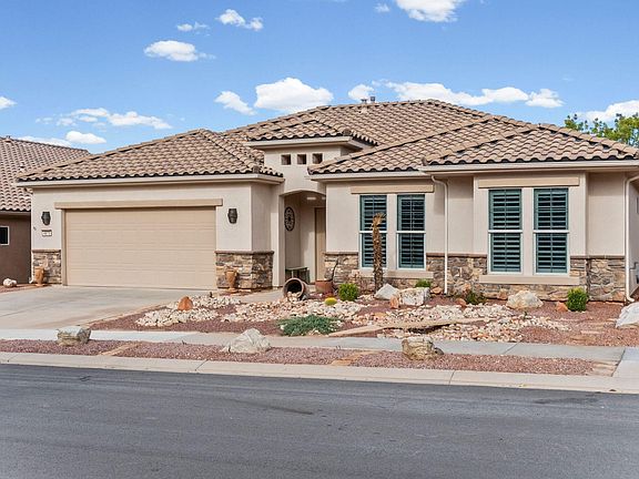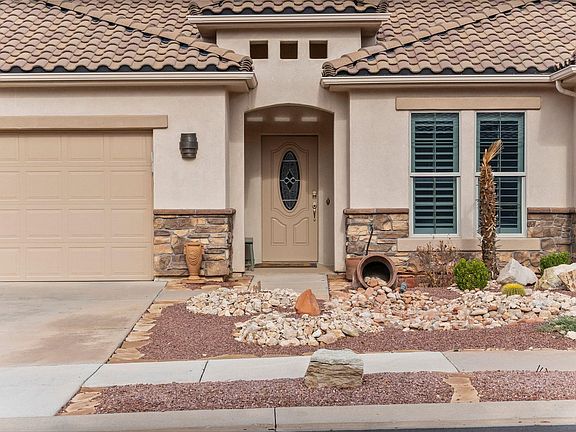 Experience vibrant 55+ living in Sun River, Southern Utah's premier active adult community with top-tier amenities including indoor/outdoor pools, pickleball & bocce courts, a fitness center, library, game room, computer lab & more! This move-in ready home features a spacious split floor plan, kitchen with stainless steel appliances, granite countertops & a large walk-in pantry, perfect for hosting or everyday ease. A front-load washer & dryer are included & the furniture is negotiable for a truly turnkey move. Both the water heater & water softener are brand new, offering peace of mind & added value. Low-maintenance xeriscape includes faux grass in the backyard - no mowing, no hassle. A north-facing patio, which is shaded & private, is ideal for enjoying the beautiful mountain views!