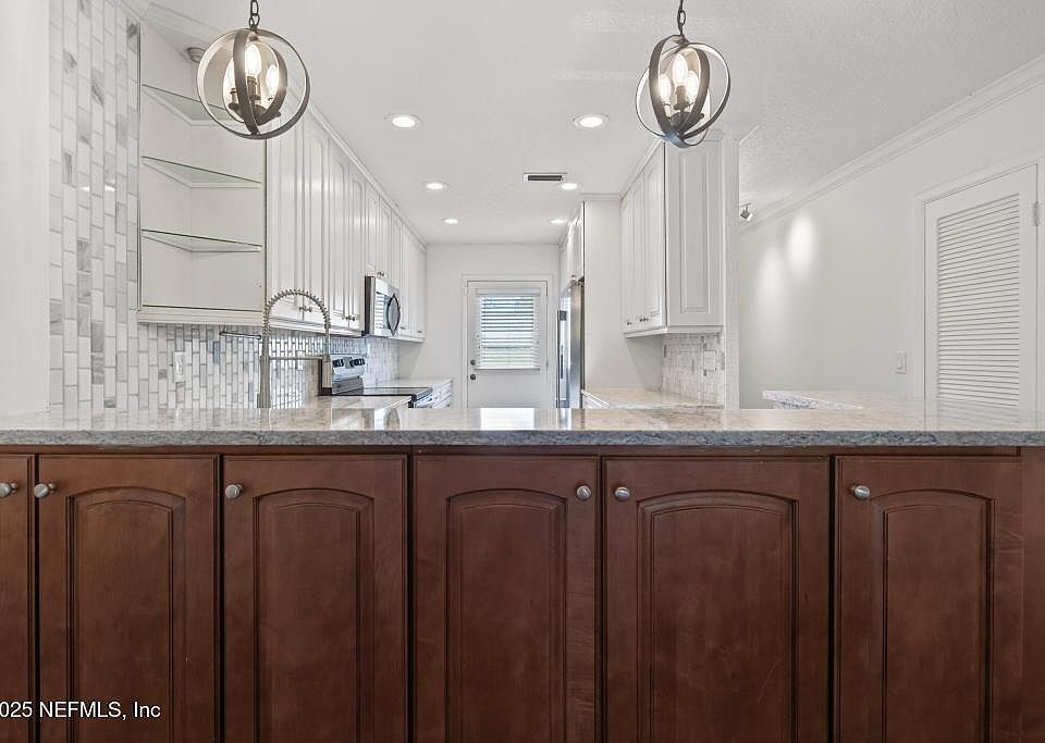 Beautifully updated first-floor 2 bedroom 1.5 baths condo just minutes from San Marco Square, offering modern finishes, exceptional storage, and rare private outdoor living. The updated kitchen features granite countertops, tall cabinetry, stainless-steel appliances, a marble mosaic backsplash, and a wide countertop open to the dining area for a connected feel. The spacious living room is filled with natural light from a full wall of sliding glass doors that lead to the oversized private patio, available only to first-floor units.