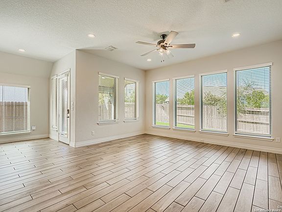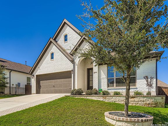 The 2021 Perry Homes design in Schertz's Homestead community demonstrates how modern construction can deliver both immediate comfort and long-term practicality. This single story floor plan spreads 2,439 square feet across four bedrooms and three baths, creating a layout that accommodates how people actually live - with dedicated spaces for work, rest, and gathering that don't force compromise. Wood-look tile flows throughout the main living areas, offering the warmth of natural materials with the durability you need. The kitchen anchors daily life with granite counters, extensive cabinetry, and a walk-in pantry that makes meal planning less of a puzzle. A five-burner Bosch gas range gives serious home cooks the control they want, while the counter-depth stainless refrigerator maintains clean sightlines. The reverse osmosis system and water softener work quietly in the background, improving everything from morning coffee to evening showers. A study with French doors provides the flexibility that defines contemporary home life - whether you need focused workspace during business hours or a quiet retreat when the household is full of hustle and bustle. The primary bath includes framed mirrors that elevate the space beyond builder-grade basics, reflecting the home's overall attention to finish details. Outside, the covered patio extends living space into the Texas climate, with a gas hookup ready for weekend grilling and pavers framing the driveway to add definition to the home's street presence. The privacy fence includes integrated lighting, transforming the backyard into usable space after sunset. A full sprinkler system maintains the established landscaping without the usual weekend obligations, while the Generac generator and EV charger address infrastructure needs that many homes still lack. The Ring doorbell and security system provide the connectivity that has become standard for modern households, managing access and monitoring from wherever life takes you. The Homestead community continues expanding its master plan, with additional trails, parks, and a new school coming in the near future - and be sure not to miss the existing resort-style pool. This home bridges the gap between new construction efficiency and lived-in practicality - a 2021 build that has been refined with upgrades while retaining that new home warranty and energy performance.