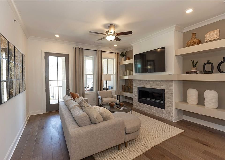 The Cascade at homesite 241 offers luxurious, single-level living in exclusive Waterside by The Providence Group! As you enter the condo, you are greeted by a spacious open concept living area that seamlessly combines the family room, kitchen and dining space. The attention to design detail is displayed throughout, from the modern kitchen with stainless appliances, Brittannica quartz countertops, beige cabinets and a contrasting, driftwood stained island with luxe gold hardware and faucet. The family room serves as the heart of the home with its stylish linear fireplace- offering ample space for relaxation and entertainment. A door off of family room leads to a covered porch for enjoying the outdoors. The condo features 3 well appointed bedrooms with elevated ceiling heights that adds to the sense of luxury and comfort. The primary bedroom is located opposite the 2 secondary bedrooms offering added tranquility. The generous primary bedroom has a sitting area to give a quiet, private space for reading or lounging. Luxury continues to the primary bath with a frameless, tile shower and a freestanding tub for the ultimate in relaxation. Resort-style amenities, including a clubhouse with fitness center, pickleball courts, pool, and fire pit areas, add to the allure of this community, making it easy to connect with neighbors and friends. Interested in visiting? It's important to note the safety measures in place due to the active construction zones. Agents and visitors are required to check in at the office before viewing homes and may need to wear safety gear like closed-toe shoes and hard hats. The Cascade provides an exceptional opportunity for those seeking a blend of modern design, comfort, and community living in Peachtree Corners. [The Cascade]
