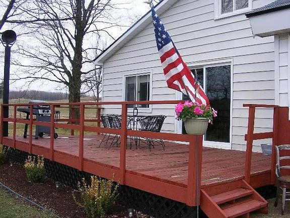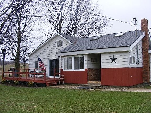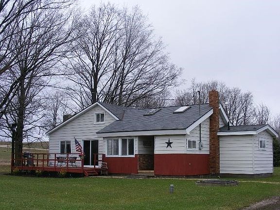 Private country setting surrounded by larger parcels provides an awesome amount of elbow room. Home is very nicely updated, there are no other homes close enough to be in your view when looking out the windows! The 5 acres are open land with fencing suitable for horses. Electric baseboard heating system in place but seller primarily uses Quadrafire Pellet Stove as heat source (used less than 4 tons of pellets in Arctic Blast winter of 2013/2014). The kitchen offers an open beam vaulted ceiling finished in knotty pine. The skylights and gable-end window flood the kitchen and dining room with natural light making them a focal point of interest you are sure to enjoy! The living room is very large and has terrific southern exposure to natural light. The site includes a useable root cellar, chicken coop and small animal stable. Water source is a modern 4 inch style well, the kitchen appliances are relatively new and the home is in move-in ready condition.