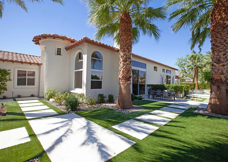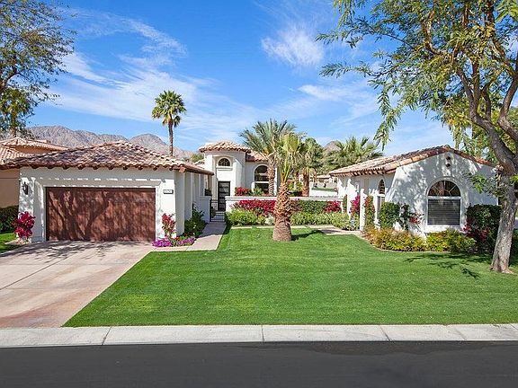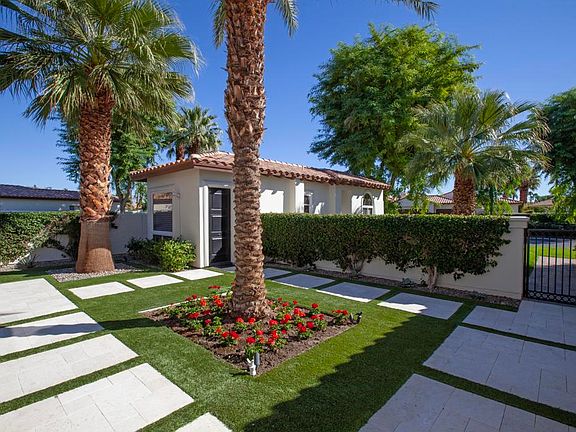 Step into refined desert sophistication at this stunningly remodeled contemporary retreat in the prestigious Rancho La Quinta Country Club. Every element of this residence has been masterfully curated to embody modern elegance, comfort, and tranquility. With no other home in the community offering such extraordinary fairway and mountain views, the setting feels like living inside a constantly changing work of art. From the moment you arrive, the lush landscaping, architectural precision, and commanding curb appeal set the tone for something truly special. Situated on an expansive 14,375 sq. ft. end lot with no neighbor on one side, this home is designed for ultimate privacy and serenity. The outdoor living spaces are nothing short of resort caliber. An entertainer's dream featuring a dramatic custom patio, sparkling pool and spa with cascading waterfall, fire pit, and sweeping vistas of the south and west mountains glowing at sunset. A two-room detached guest casita provides comfort and autonomy for guests, blending seamlessly into the design yet offering its own quiet retreat. The main home invites you through a striking custom front door crafted of hot-waxed glass and rich wood, revealing a light-filled great room that perfectly balances openness with warmth. Walls of windows frame the spectacular views, while a thoughtfully reimagined floor plan achieved by removing a dividing wall unites the kitchen, dining, and living areas in perfect harmony. Dual modern fireplace walls create dramatic focal points, complementing soaring ceilings and sleek architectural lines.The chef's kitchen is a showpiece in itself, anchored by a massive quartz-topped island ideal for entertaining. Outfitted with premium stainless-steel appliances, Cambria stone surfaces, refreshed millwork, and a climate-controlled wine cellar, it's designed for both daily indulgence and gourmet artistry. Control 4 home automation seamlessly integrates lighting, climate, and sound throughout the home, offering luxury at your fingertips. Every detail reflects quality: travertine floors, refined base molding, custom window treatments, and designer lighting that sets a warm, ambient glow. Even the practical spaces shine. The expanded four-car garage features epoxy flooring, dedicated air conditioning, and a custom wood-look door. A paver driveway and meandering walkways tie the exterior together with effortless elegance. Offered partially furnished. Please see Improvements and Amenities list.