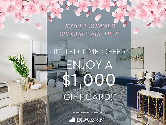 AboutLimited Time Offer | Enjoy A $1,000 Gift Card!*Attractively landscaped properties offer 1, 2, and 3 bedroom well-maintained North Toronto condo-style apartment rentals without the fees. Located close to the highway and area amenities, suites are beautifully renovated with dark cabinetry, stainless steel appliances, gleaming hardwood floors and chic bathrooms. Residents benefit from convenient online payments and maintenance requests, recently upgraded on-site laundry facility, community BBQ area, and professional on-site management.Community -With public transit outside your apartment, in this quiet neighbourhood you will have access to all the conveniences located on Bathurst street from drugstores to grocery and entertainment options.North York soccer fields are across the street and Northview Heights Secondary School is moments away.If you are looking for green space, Acona and Antibes Parks are close by and the walking paths of the Finch Corridor and the Dufferin Creek amenities are easily accessedRental Process -We are open for business and have refined our online rental process. View our 360-degree virtual tours, which give a general sense of unit layouts and finishes. We also encourage you to schedule a personal showing with our leasing specialist who would be happy to safely tour you through amenities and available suites.Online Payments and Communications -Property Vista resident portal is available to ensure the ease of rental payments, maintenance requests, and communication with property management all accessible online from your personal device.*Pricing, availability, and incentives are subject to change. Conditions apply. Suite features may vary. Images and virtual tours may not reflect actual suite finishes. E. & O.E.Community AmenitiesVisitor parkingOutdoor parkingElevatorsPublic transitPet friendlyCommunity BBQOn-Site Professional ManagementConvenient online payments & maintenance requestsSecurity camerasOn-site Laundry FacilitiesSuite AmenitiesFridgeStoveDishwasher availableCeramic floorsHardwood floorsMicrowavePatiosUtilities IncludedHeat