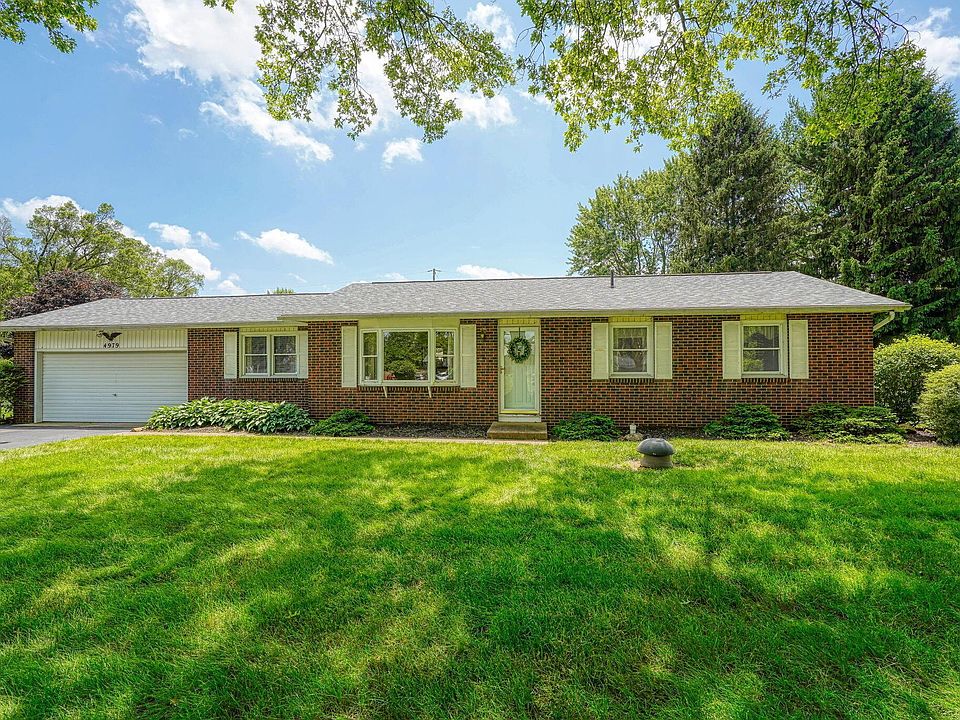 Welcome to your little piece of heaven! This charming, well-maintained one-owner ranch home is ready for its next chapter and its next loving owner. Nestled on a generous half-acre lot, there's plenty of space for kids, pets, and outdoor enjoyment. Step inside and be greeted by natural sunlight pouring through the front bay window, creating a warm and welcoming atmosphere. The home is move-in ready, featuring brand new carpeting and a professional deep clean. For those who love character, real hardwood floors lie beneath the carpet, ready to be revealed and restored to their original beauty. The spacious eat-in kitchen offers room for a dining table and hutch, perfect for family meals and entertaining. Just off the kitchen, you'll find a cozy family room centered around a beautiful stone wood-burning fireplace, complete with built-in shelving, ideal for displaying your favorite keepsakes. This home includes three bedrooms, with the primary suite featuring a private half bath. A shared full bathroom serves the additional bedrooms. Updates throughout the recent years include: Replacement windows, New HVAC system (2014),