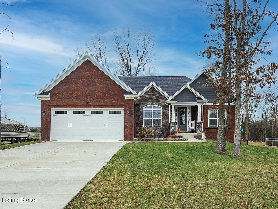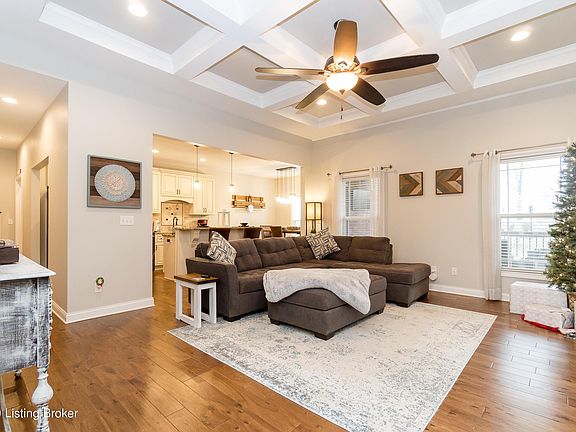 Welcome to this lovely 5 bedroom, 3 bathroom ranch on an expansive 1 acre lot. Entering via the covered front porch, you're immediately struck by the brilliant hardwood floors continuing into the great room. On your left, you'll find the first bedroom with a large double window, perfect as an office or sitting room. Continuing further brings you into the vast, open great room, the hardwood floors brightly accentuated by the natural light from the large windows, all resting beneath coffered ceilings. Open to the great room is the eat-in kitchen, boasting a large island with a bar, granite countertops, a tiled backsplash, ample cabinet space, stainless steel appliances, and a pantry. An exterior door leads from the kitchen to covered upper deck, equipped with a ceiling fan and an outlet for