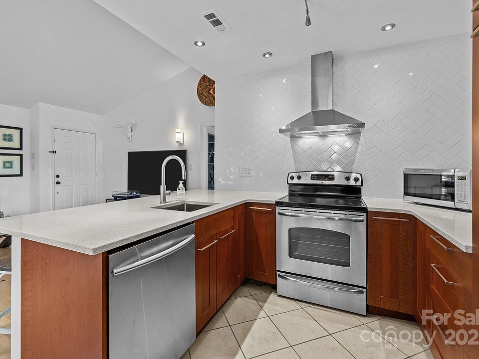 Reimagined and move-in ready for the most discerning buyers! This stylishly updated townhome features a stunning kitchen with quartz counters, counter-to-ceiling herringbone tile, chimney vent hood, and new cabinetry with smart storage. The open layout flows into a vaulted living room with views to the enlarged deck through brand-new energy-efficient sliding doors. A converted garage offers a flexible space, finished as a home gym with LED lighting and thick Berber carpet. Bathrooms feel spa-like with floating vanities, efficient toilets, designer lighting, and floor-to-ceiling shower tile with a seamless glass door. A convenient half bath offers direct access to one bedroom. Rich, mixed-width birch wood flooring runs throughout. Modern updates, thoughtful design, and versatile spaces make this home a rare find! Must See!