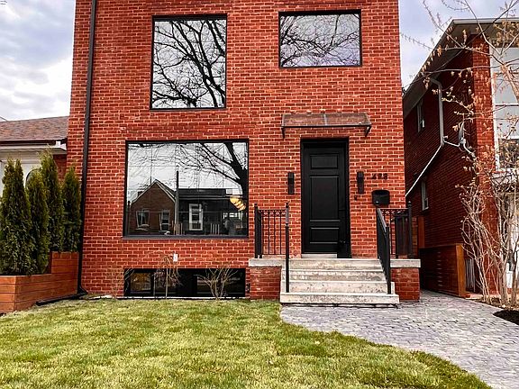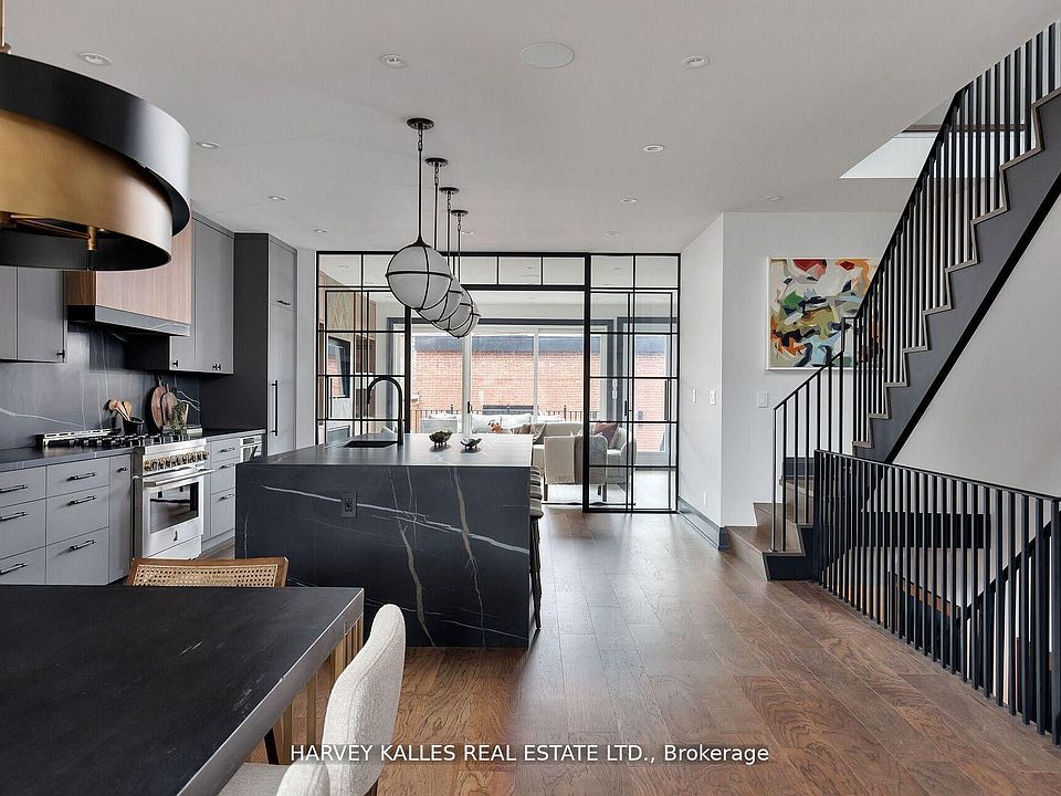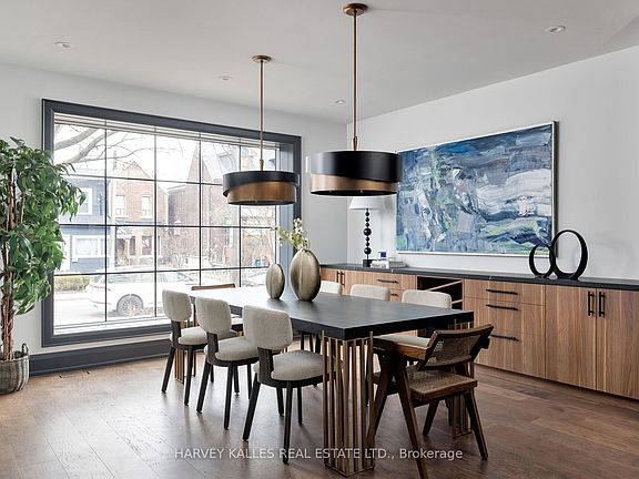 Toronto's take on a New York-inspired industrial soft loft. A rare detached family home offering nearly 4,500 sq ft of living space across four levels, with approximately 3,100 sq ft above grade, set on a 27.98-ft wide lot. Neighbourhood-defining interior design by Glen Peloso.The bright, wide-plank main level features an east-facing dining area flooded with natural light, flowing into a custom chef's kitchen with oversized island, separate built-in refrigerator and freezer, bespoke lighting, and exceptional storage. Factory-inspired glass walls and double doors lead to an elegant family room with fireplace, custom built-ins, and a full wall of glass opening to a large outdoor deck. A rear mudroom with built-in seating and storage adds everyday functionality. Powder room finished with custom New York streetscape wallpaper.The primary retreat occupies the entire third floor, introduced by a dramatic landing with an east-facing sunroom wrapped in floor-to-ceiling windows, complete with coffee station and wet bar. Step out to a city-view observation deck with open eastern exposure. The primary bedroom features abundant natural light, custom built-ins, and fireplace, complemented by a spa-like ensuite and an exceptional walk-in dressing room with centre island, skylight, and extensive shelving.The second floor offers a large bedroom with private 4-pc ensuite, two additional generous bedrooms with balcony access, a full laundry/utility room, and an additional 4-pc bath.The lower level spans approximately 1,200 sq ft, featuring a substantial recreation room, glass-enclosed wine cellar, nanny or guest suite, 4-pc bath, and cantina. Large 2.5-car garage with laneway access. Dual HVAC systems.