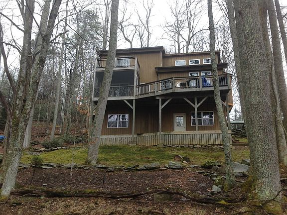 Timberframe custom built home with a garage apartment in gated community. Screened-in porch, multiple decks and outdoor firepit area. Vaulted ceilings in great-room and kitchen with stone fireplace. Detailed accents include custom built rustic cabinets and railings built using rhododenron and mountain laurel branches.