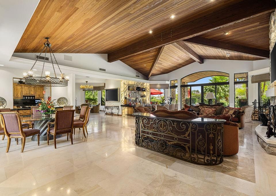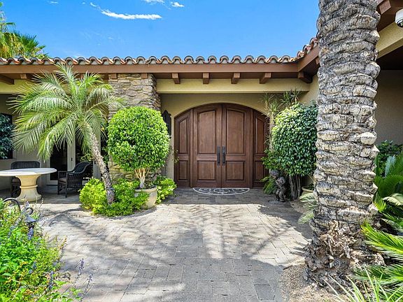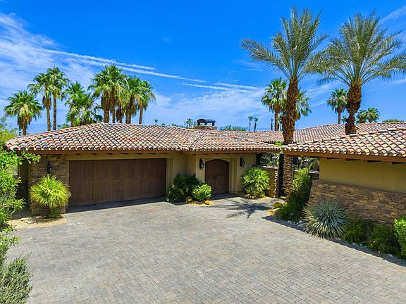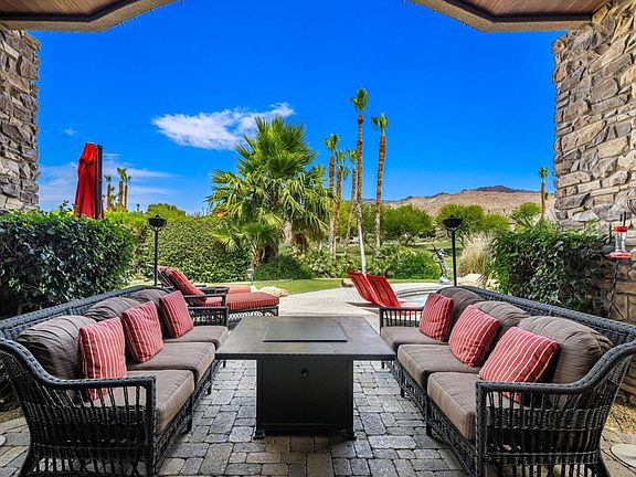 This extraordinary estate in the prestigious Canyon View Estates at Ironwood Country Club seamlessly blends refined architecture, cutting-edge innovation, and stunning natural beauty. Perfectly situated along the 16th fairway, the custom residence offers sweeping mountain and river feature views, exemplifying elevated desert living at its finest.Soaring wood-beamed vaulted ceilings and a dramatic fireplace anchor the expansive living area, flowing effortlessly into the resort-style outdoor space. Seamlessly blending indoor-outdoor living, the saltwater pool and spa features elegant deck jets, 30 LED color settings, water fountain features, and an integrated misting system for year-round enjoyment.The outdoor kitchen is fully equipped for grand-scale entertaining, while indoors, two 100-bottle wine refrigerators cradle your finest vintages. A stunning illuminated onyx bar adds the perfect glow to cocktail hour under the stars.The home boasts a wonderfully spacious kitchen featuring stainless steel appliances, including a double oven, two large Sub-Zero refrigerators, 3 stoves, 3 dishwashers, a large breakfast bar, abundant cabinet storage, and granite countertops. Four spacious en-suite bedrooms offer restful privacy, and the primary bedroom is a serene sanctuary. A vaulted climate-controlled bonus room that provides the ideal space to store valuable collections or create a private fitness studio. The laundry room features two sets of stackable washer and dryers for ultimate convenience. Car enthusiasts will appreciate the two fully climate-controlled 2-car garages, each with its own golf cart bay, outfitted with mini-split systems, epoxy flooring, and built-in cabinetry--designed to accommodate and protect your most prized vehicles. Eight total air conditioning zones, whole-home indoor-outdoor surround sound, and remote-controlled lighting deliver smart comfort throughout. Located just minutes El Paseo and The Living Desert. HOA dues are $599 per month.