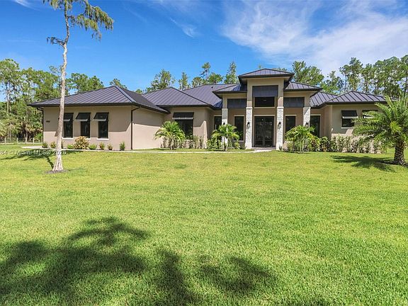 Discover your private retreat in Logan Woods. This new estate sits on nearly 3 acres, offering space, privacy, and a refined Naples lifestyle minutes from beaches, dining, and shopping. The open layout features wood-look porcelain tile, soaring ceilings, and a chef’s kitchen with custom cabinetry, premium appliances, gas stove, walk-in pantry, and spacious island with brass accents. A wet bar with wine fridge adds convenience. The primary suite includes a spa-style bath with soaking tub, dual vanities, double shower, and outdoor shower, while all bedrooms have walk-in closets and en-suites. Outdoors, enjoy a screened living area with summer kitchen, fireplace, and sparkling pool.
