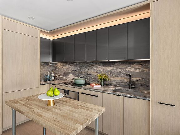 Designed by the renowned INC Architecture & Design, Residence 7D-N features oversized, triple-glazed windows and wide-plank European Oak flooring. The custom kitchen is outfitted with soft-close milk oak cabinetry, honed Fusion Blue Quartzite countertops, and a full suite of integrated Gaggenau appliances.
