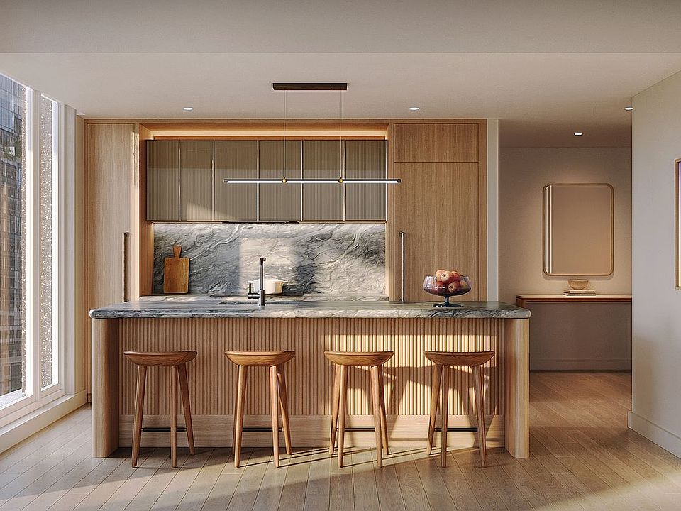 The custom-designed chef’s kitchen is adorned with honed Fusion Blue natural stone countertops and backsplash, Milk Oak Shinnoki soft-close cabinetry, and fully integrated best-in-class Gaggenau appliances.