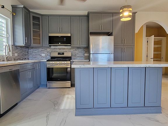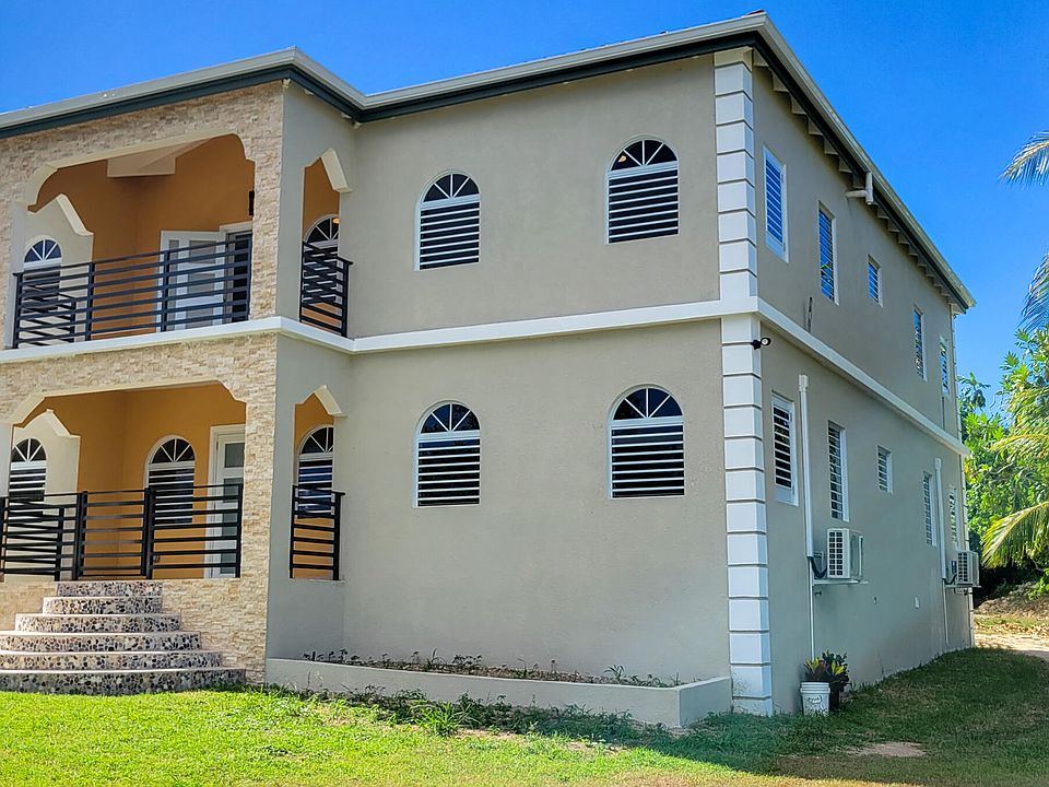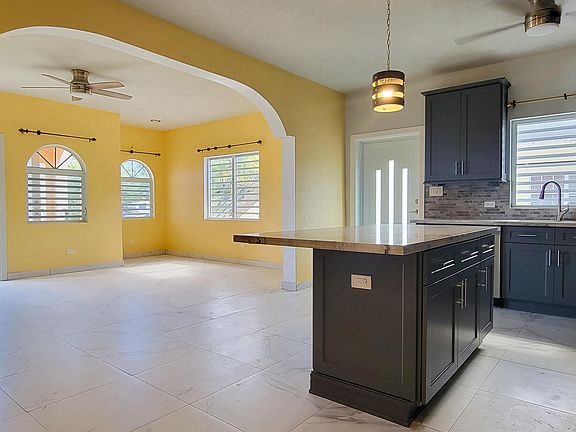 This one year old home is 3 bedrooms and 2 bathrooms. The kitchen is equipped with stainless steel appliances including a dishwasher. A tiled backsplash and granite counter tops with island leads to the open concept living/dining area. Primary bedroom has ensuite bath and luxurious touches. Ceiling fans throughout the house (total of 6) and split AC's in bedrooms. There is plenty of storage and a laundry room. Property management done by builder/owner. Other details include curtain rods on each window; tile moulding on the floors, beautiful lighting, built in toiletry storage in showers; electric outlets in kitchen island. Beautiful arches, decorative walls, cooling breezes. Concrete driveway and parking slab at the rear of the building.