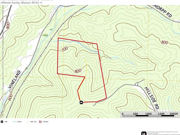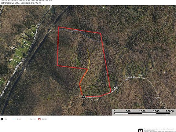 Discover the perfect blend of seclusion and convenience with this 69-acre property, located just outside De Soto, Missouri, and within an hour's drive of St. Louis. This expansive parcel offers a prime opportunity for hunters and outdoor enthusiasts, as it is loaded with deer and turkey, with multiple sightings when viewing the property. A wet weather creek runs through the bottom, adding to the natural allure and providing a vital water source for wildlife. With no restrictions or HOA, you have the freedom to shape this land to your vision. The property boasts several high point spots ideal for building your dream home or cabin, offering stunning views and privacy. Property includes 2 acres+/- of ""Elephant Rocks"" type formation back near the creek in the NW portion of the property. There are also a few small clearings perfect for campsites or food plots. This is a rare opportunity to own a substantial piece of land with excellent hunting potential, beautiful building sites, and the freedom to create your own retreat. Don't miss your chance to experience the best of Missouri's outdoors on this versatile and inviting property.