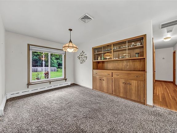 THE BEAUTIFUL RANCH you have been waiting for is now waiting for you! Centrally located in the Town of Hamburg on a stunning lot, just minutes from Lake Erie and the Village of Hamburg, this three-bedroom, 1½-bath home sits on nearly a half-acre wooded lot and comes with the space and comfort you desire. The large, cozy family room - with a newer gas-insert fireplace, built-in shelving and picture window - helps make this home feel larger than its 1,364 square feet. Generous size in all bedrooms. Looking for a workshop or extra space for cars or a boat? Check out the extra two-car garage behind the home. Stunning hardwood floors in all three bedrooms and more hardwoods waiting to be uncovered in the family and dining rooms. Eat-in kitchen includes refinished cabinets and corner windows. Updated full bathroom. Basement is dry and massive. New boiler was installed in 2021, new air-conditioning condenser in 2022, updated electric, glass-block windows in basement, newer sump pump and more. Property includes patio, fence (2018), turn-around driveway and plenty of space. Very nice home with even more potential. All offers, if any, will be reviewed at 11 am Monday, June 17.