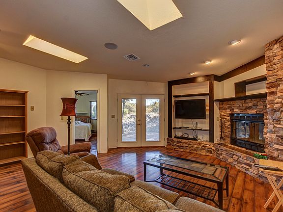 Welcome to Yavapai Hills, conveniently located near shopping, restaurants, the mall and more! This 1,320 sf 2 bed, 2.5 ba, 2 car garage townhome was built in 1986. It features an open floorplan with wood flooring, built-in speakers, and ceiling fans throughout. The living room includes a beautiful stone woodburning fireplace and french doors leading out to the patio. The kitchen includes a breakfast bar with pendant lighting and SS appliances. Outside there is a large sun deck with amazing mtn views-perfect for entertaining, and a separate back patio for grilling or just relaxing.The good-sized master suite features 2 closets, custom tile detail at the built-in garden tub, sep shower, dual glass sinks at the vanity, and much more! You will appreciate the custom details in all baths!