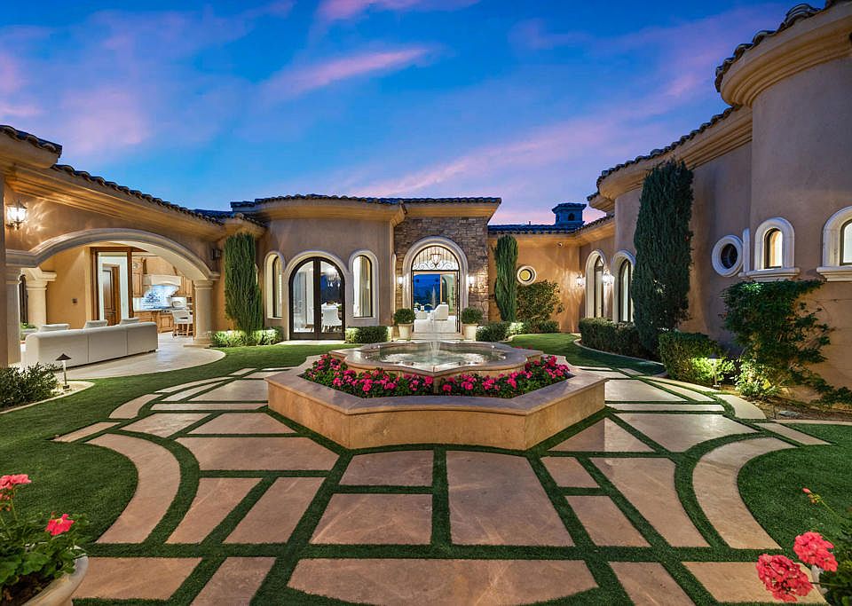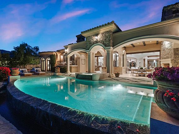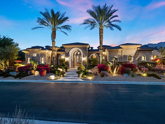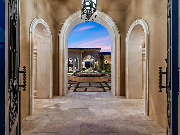 Villa Sul Lago - Designed by Juan Carlos Ochoa Architect. Situated in Ironwood Country Club's exclusive Canyon View Estates, this distinctive Mediterranean Lake View Villa offers the ultimate in Desert Luxury Lifestyle living. As you enter this beautiful, gated Palazzo style courtyard, artfully designed marble columns, archways, custom fountain, paver stone and turf walkways instantly become your focal point. Step inside this home, immediately you are awestruck with the most incredible pool, lake, golf course and panoramic mountain views, an expansive beautiful living space with soaring ceilings, exposed beams, marble stone floors and arches, and hand-crafted custom doors, trims and cabinets. The dining room with glass wine room and lake view centered wet bar offer great spaces for entertainment. Multiple sliding doors disappear, creating the ultimate in indoor-outdoor living. A terraced media-room library with fireplace provides additional space for work, media, relaxation and remarkable views. The sumptuous lake view primary suite has wood floors, marble fireplace and chandelier, a spa like luxurious dual bathroom, walk-in closets and direct laundry room access. The large kitchen with island and breakfast bar creates comfortable yet functional home and resort style living spaces, open to greatroom and courtyard loggia with media and fireplace, outdoor kitchen and putting green, and separates main house and casita guest house and gym. There are three beautifully spacious and comfortable guest suites including Casita. A climate controlled 3-car garage plus two golf cart space completes this estate home. This home is sited on one of the best view lots in Canyon View Estates and offers the ultimate in Desert Lifestyle Living. Ironwood CC offers 24-Hr Guard gated security, two 18-hole Golf Courses, Tennis, Pickleball, Fitness Ctr, amazing Clubhouse and more. NO expense was spared in this exclusive offering.