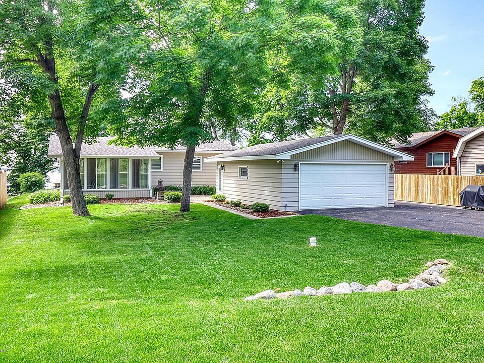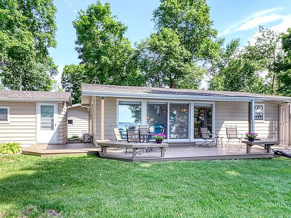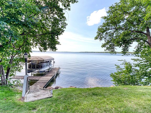 Enjoy gorgeous sunsets from this remodeled year around home on Pelican Lake with a lakeside bunk house and a 2 car garage. A nice deep lot with 66 ft of lake shore frontage, hard sand bottom, and rip rapped shoreline. The remodeled kitchen has an open floor plan with new maple cabinets, stainless appliances, wide plank flooring, quartz counters, and a kitchen island. Beautiful remodeled bathroom as well. New lighting, window treatments, water heater, AC split system and more! The lakeside floor to ceiling windows and large patio door offer amazing views and open to a partially covered deck. The front side enclosed patio works as a perfect sun room with awesome morning sun. Mound septic system! Survey! Dock included!