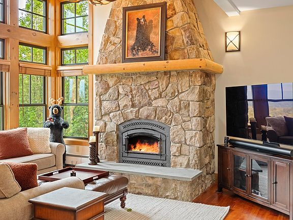 Cozy stone fireplacePanoramic vistasBonus loft roomSoaring ceilingsTranquil outdoorsSpacious deckHigh-end finishes