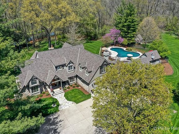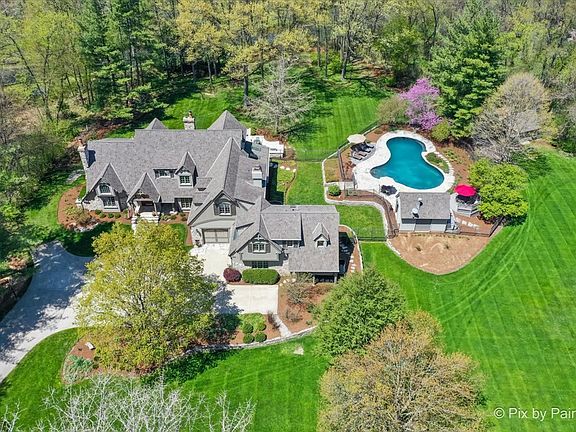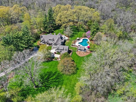 Nestled among lush woods and tranquil Ferson Creek, this stunning English Tudor-style Estate on 7+ acres has a multitude of luxurious amenities, perfect for those who crave the peace and serenity of nature. With six bedrooms and four and a half bathrooms and a private apartment suite, there is ample room for even the largest of families. Also enjoy a sun room, screened porch, a main level bedroom adjacent to a full bathroom and a finished basement. The front entry shows off the formal dining room, light-filled living room, foyer and family room. The open staircase leads up to an overlook of the family room and the beautiful stone fireplace. As you enter the home from the garage, you are greeted by a beautifully rehabbed mudroom that provides a welcoming space to take off your shoes and hang up your coat and serves as an office or study space. The kitchen is also rehabbed and is equipped with top-of-the-line appliances, granite and quartz counters, and plenty of cabinet space. On the main level, there is exterior, private access to a 2-story private guest suite or apartment, complete with its own full bathroom and kitchenette. The separate fenced in courtyard is perfect for kids or pets. This space is perfect for hosting guests or for use as an in-law suite, a nanny suite, even a yoga studio. The finished basement offers even more living space, with a game room that is perfect for entertaining, as well as a family room, kitchenette and additional storage. Step outside and you'll find a fenced yard that offers privacy, as well as a dark-bottomed pool that is perfect for natural heating in the summer. The pool house provides a convenient space to store pool toys and equipment. Two 1.5 car garages both heated and 1 is air conditioned. For those who love spending time outdoors, the shed offers ample storage for tools and equipment, and the surrounding woods and Ferson Creek provide endless opportunities for hiking, fishing, and wildlife spotting. This home is the epitome of luxury living, with its spacious bedrooms and added lofts, beautifully rehabbed spaces, dual staircase, and stunning outdoor amenities. It's the perfect oasis for those who want to escape the hustle and bustle of city life and embrace the beauty of nature. Value added features: (2023) Nanny suite rehab, interior painted; (2022) Exterior painted, 2 furnaces, 3 sump pumps; (2021) Water heater; (2020) Powder room rehab; (2019) Blue Stone patio, firepit, and built-in grill; (2018) 3 AC's, 4 skylights; (2016) Trex deck, professional landscaping; (2013) Tear-off roof, kitchen rehab.