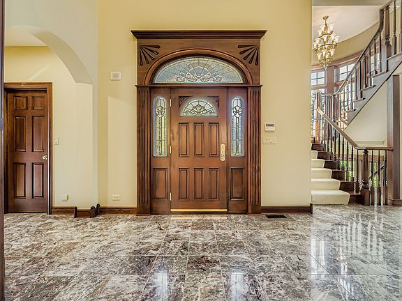 Presenting an exquisite waterfront estate showcasing timeless architectural design and exceptional craftsmanship. This all-brick residence, situated on a sprawling 2.83-acre lot within the prestigious Crane Road Estates, offers a rare blend of privacy and convenience, located just minutes from downtown St. Charles. Spanning over 10,000 square feet of meticulously maintained living space across three levels, this home exemplifies refined luxury. Features include five fireplaces, masterful millwork, an attached five-car garage, an underground sprinkler system, and a Generac generator. The stunning two-story family room serves as the heart of the home, featuring expansive windows, a built-in wet bar, and a dramatic floor-to-ceiling fireplace. The gourmet kitchen is a culinary masterpiece with custom cherry cabinetry, Dacor and Bosch appliances, four ovens, warming drawers, and a Sub-Zero refrigerator and freezer. Designed for both grand entertaining and intimate gatherings, the home offers a formal dining room, private courtyard, and multiple outdoor living spaces that seamlessly connect to nature. The primary suite is a true retreat, complete with a two-sided fireplace, a sitting area, a private balcony with pond views, and a spa-inspired bath with dual vanities and custom walk-in closets. The walk-out lower level elevates entertainment with recreation and game rooms, a large bar, wine cellar, full second kitchen, sauna, and private spa bath. Set across from the Forest Preserve and near scenic bike trails, this estate combines elegance, comfort, and convenience. Located within the boundaries of Wild Rose Elementary, Wredling Middle School, and St. Charles North High School, it represents luxury living at its finest-a rare opportunity to own a home of unparalleled distinction.