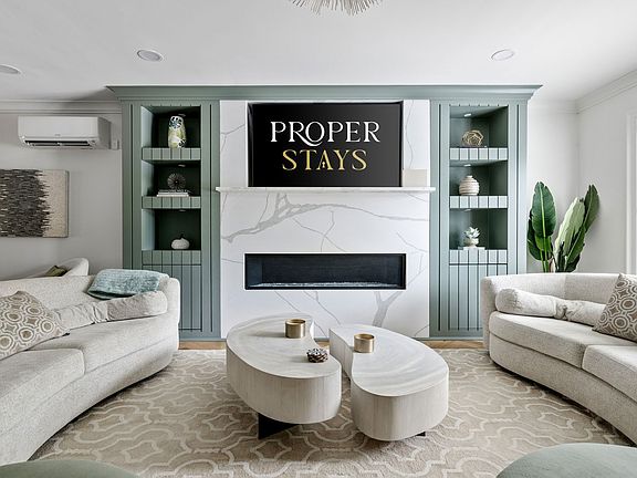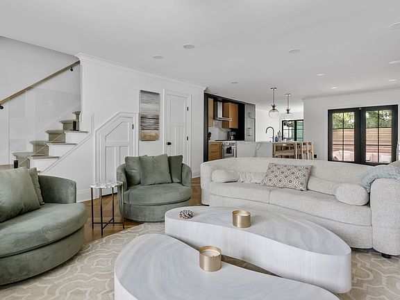 The open-concept first floor seamlessly blends the living room, kitchen, and dining area, providing a spacious and inviting atmosphere. The living room features a comfortable seating area with plush sofas and a large chair, positioned in front of a gas fireplace with a marble surround and a smart TV. The gourmet kitchen is a chef's dream, with a gorgeous island with seating for three, custom cabinetry, a gas stove, and a wet bar with a wine fridge. The dining area, surrounded by windows, offers seating for six, perfect for entertaining.