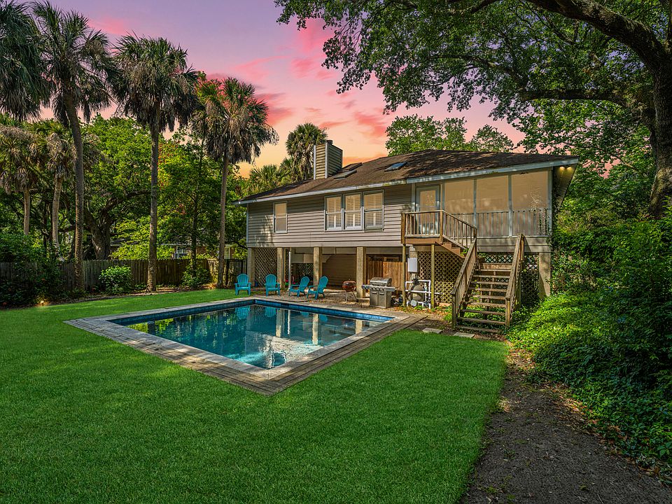 This home works great as both a desirable rental or a fantastic home to live in with a great location just a short walk to the beach and just around the corner from restaurants, shopping, and more. It also has a beautiful inground pool so one less upgrade to worry about. This home has an open floorplan great for island living. The great room has a vaulted ceiling with a fireplace with a shiplap surround and opens onto a screened porch in back overlooking the pool. The great room is also open to the dining area and kitchen. The kitchen features granite countertops and stainless appliances. Off the great rom is a spiral staircase that leads you to an upstairs loft that is currently used as a 4th bedroom that makes for some great extra space. The master bedroom has a tray ceiling and opens onto the screened porch. The updated master bath has double vanities and a huge tiled shower. The other two bedrooms share a bath on the opposite side of the house. Other features include pine floors and smooth ceilings. The highlight is the large backyard with a pool. There is an outdoor shower and plenty of storage underneath the house. This really is just a wonderful beach house for island style living!